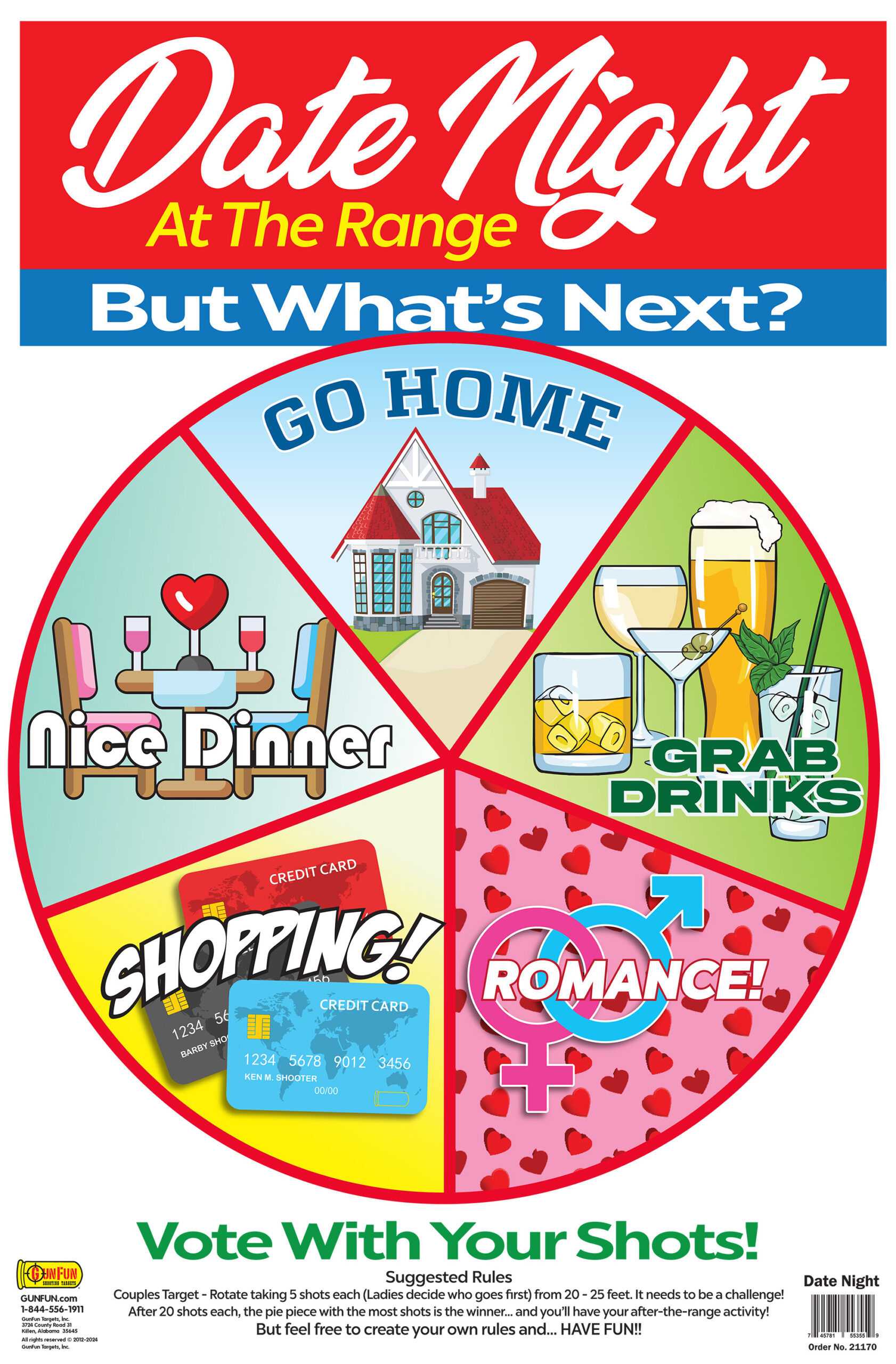 Date Night – a paper shooting target featuring a game for a couple to decide their next activity