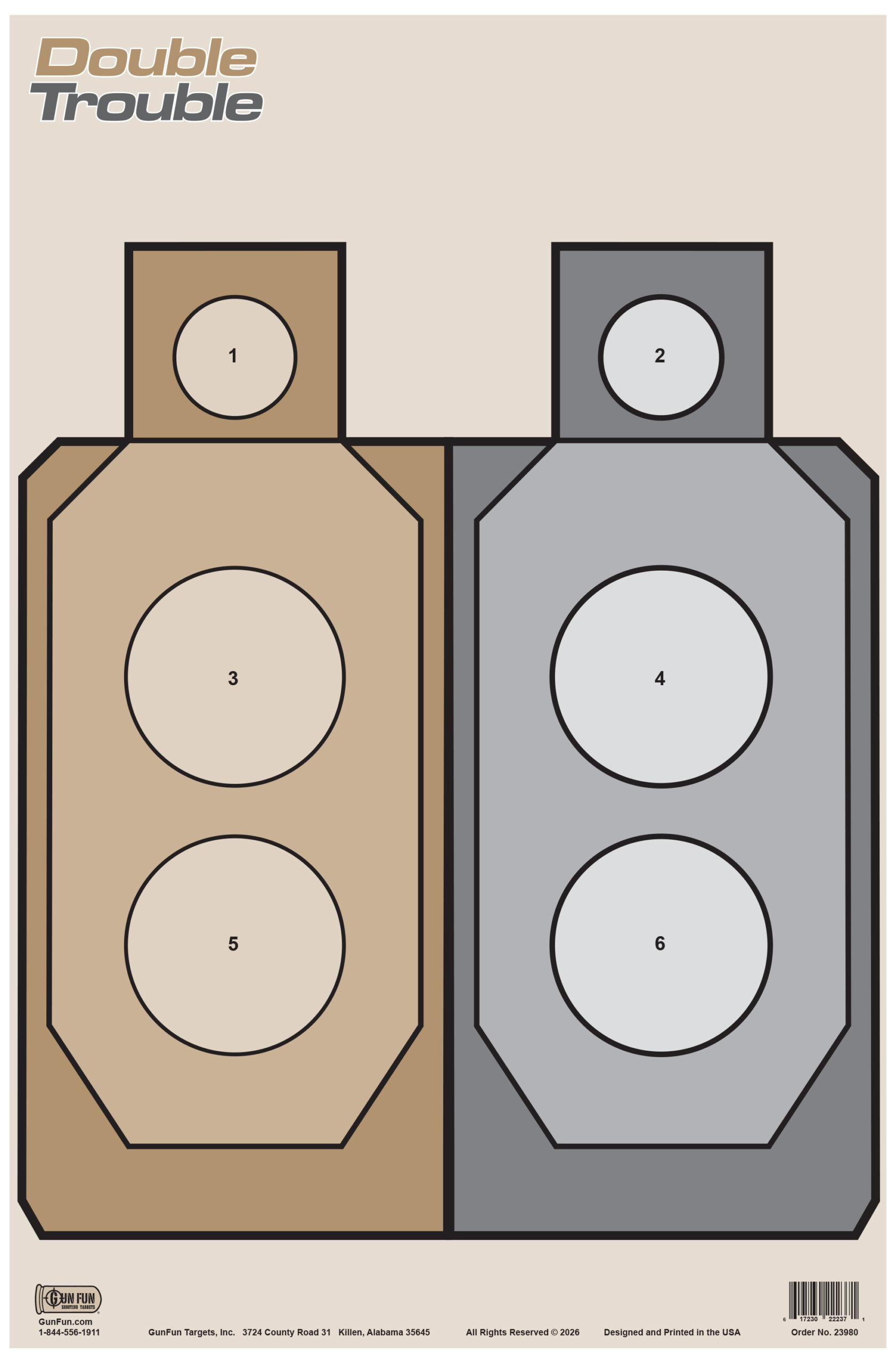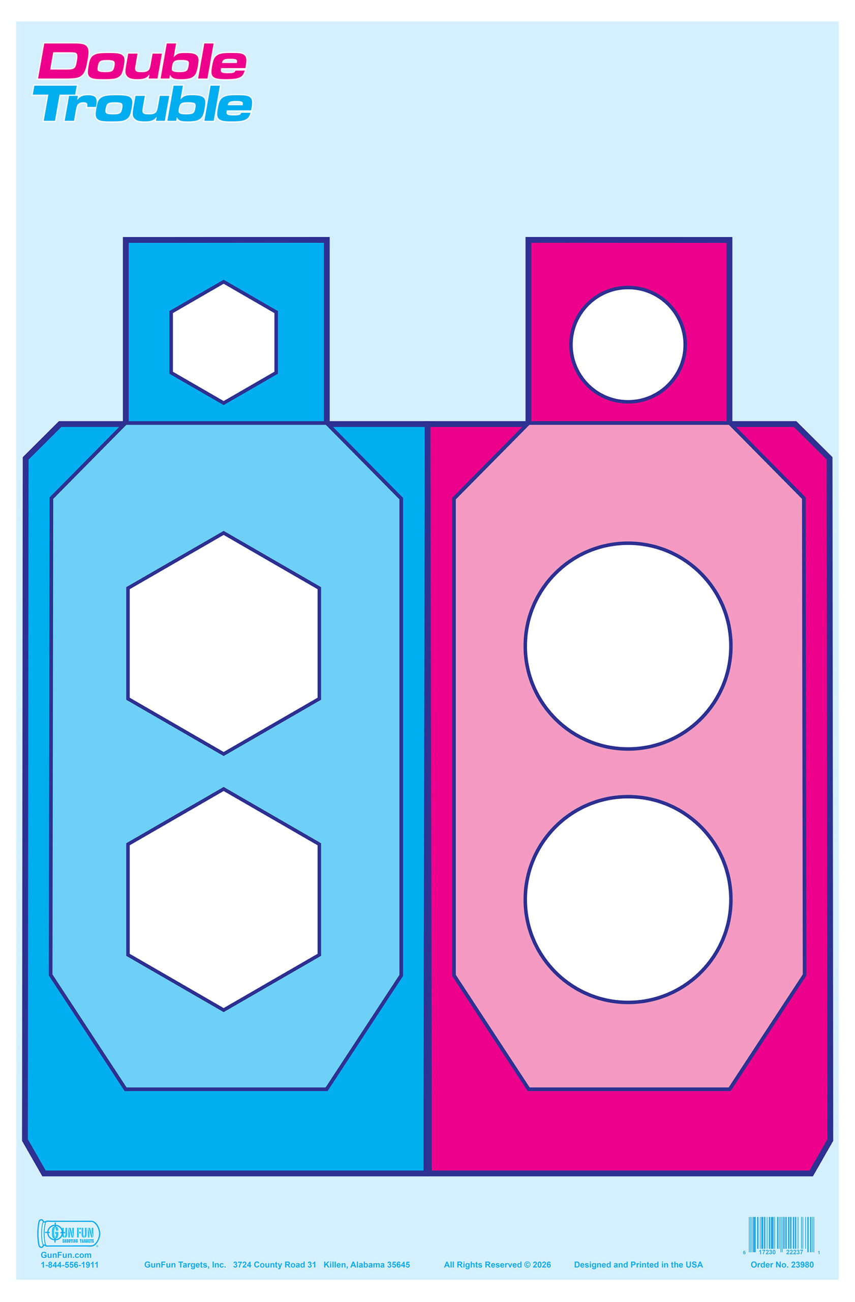 Double Trouble – A paper shooting target featuring dual IDPA-style target areas with different colors and shapes.