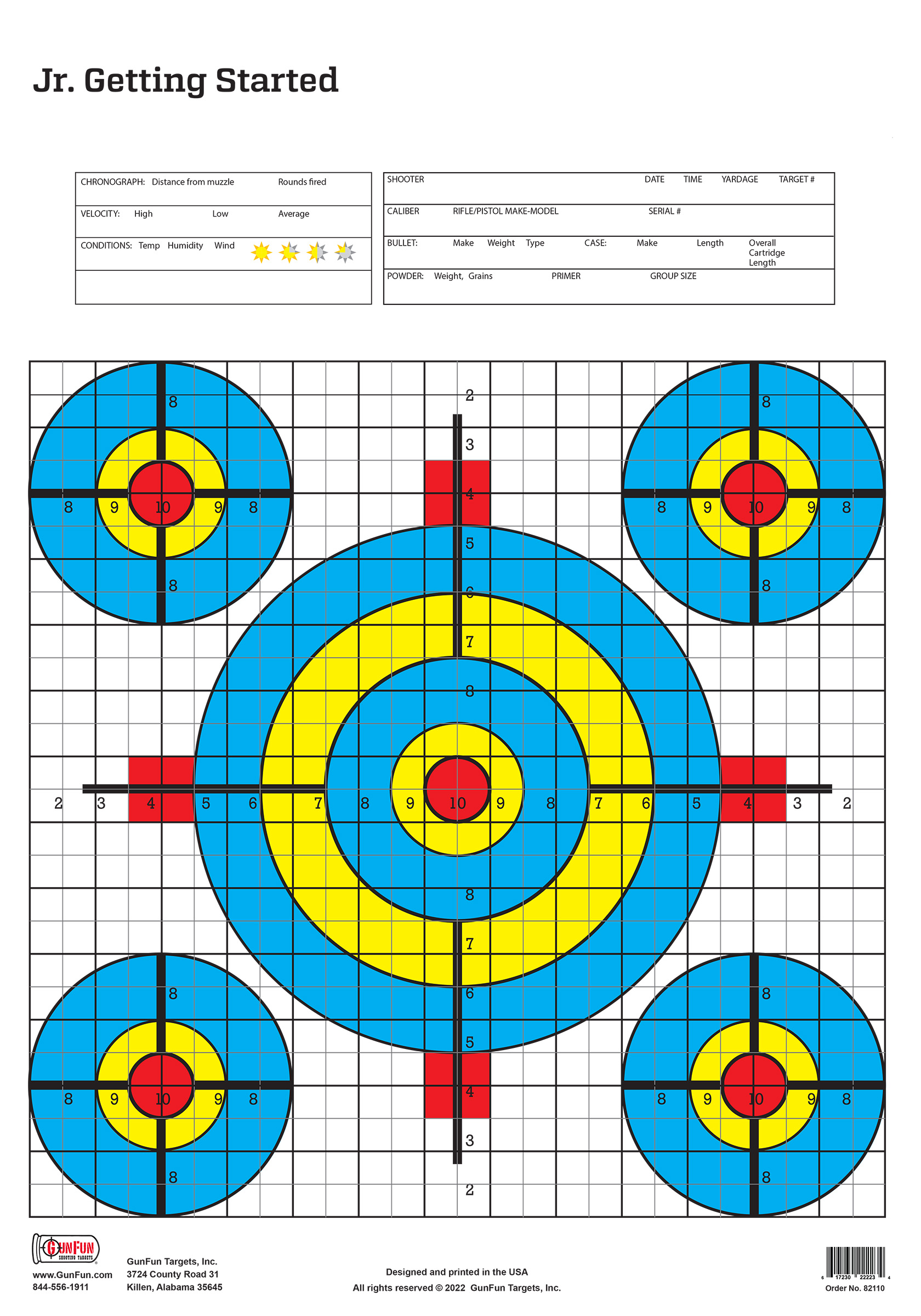 Jr Getting Started – a paper shooting target featuring gridded circles with 3 bright colors.
