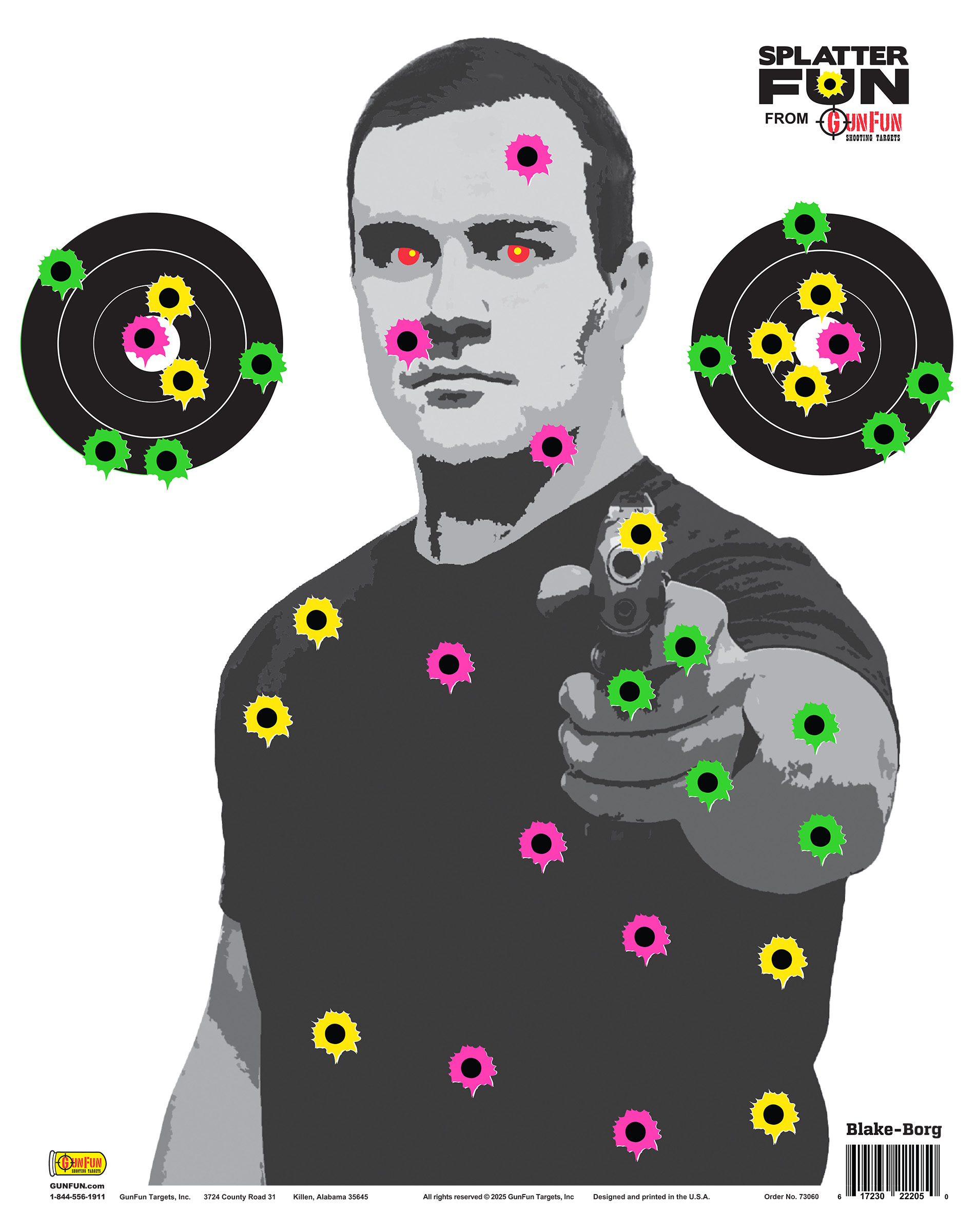Splatter Blake Borg – Splatter targets are here! This paper shooting target features a humanoid silhouette. Hits will reveal a new color, making it easy to track your shots.