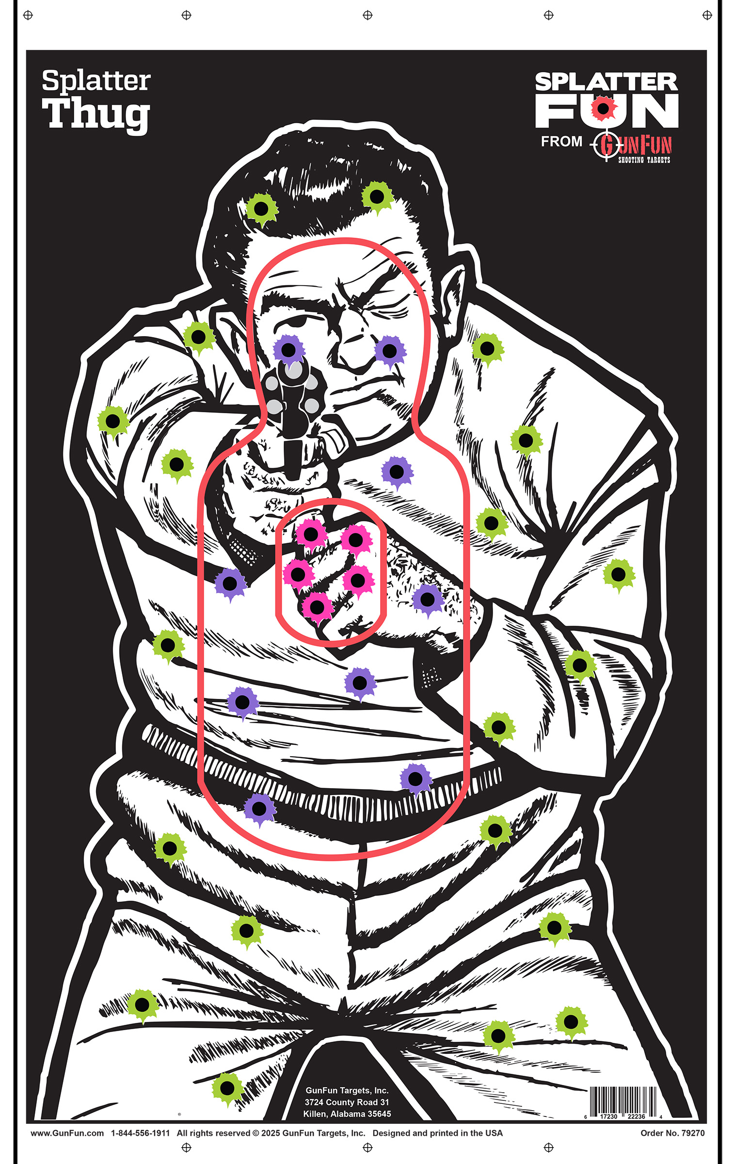 Splatter Thug – Splatter targets are here! This paper shooting target features a gun-wielding thug. Hits will reveal a new color, making it easy to track your shots.